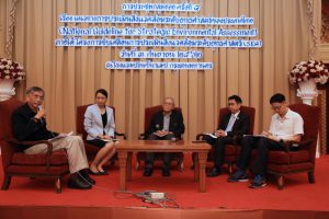 การประชุมดังกล่าวได้รับเกียรติจากผู้ทรงคุณวุฒิและผู้แทนหน่วยงานที่เกี่ยวข้องร่วมเสวนา เรื่อง แนวทางการผลักดันการประเมินสิ่งแวดล้อมระดับยุทธศาสตร์สู่การปฎิบัติเพื่อการพัฒนาอย่างยั่งยืน ประกอบด้วย รศ. ดร. สุทิน อยู่สุข ประธานคณะทำงานพัฒนาการจัดทำ SEA และคณะทำงานจัดทำคู่มือ SEA