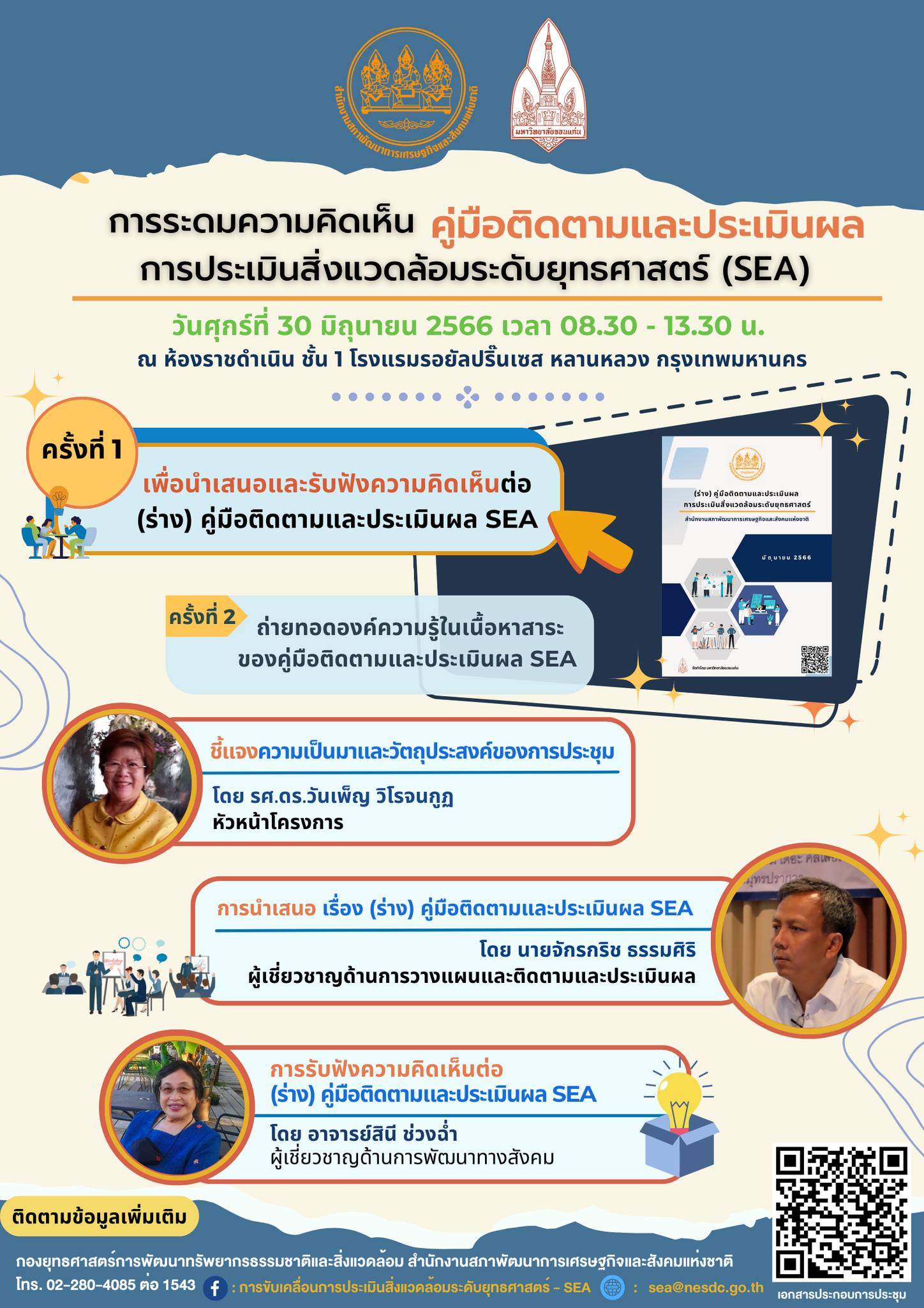 สำนักงานสภาพัฒนาการเศรษฐกิจและสังคมแห่งชาติ จัดประชุมระดมความคิดเห็นคู่มือติดตามและประเมินผลการประเมินสิ่งแวดล้อมระดับยุทธศาสตร์ (SEA) เพื่อสร้างความรู้ความเข้าใจในการกำกับ ติดตาม และประเมินผล SEA และระดมความคิดเห็นที่มีต่อ (ร่าง) คู่มือติดตามและประเมินผล SEA ที่จัดทำขึ้น เพื่อให้คณะกรรมการพัฒนาการประเมินสิ่งแวดล้อมระดับยุทธศาสตร์และคณะอนุกรรมการที่เกี่ยวข้อง รวมถึงหน่วยงานเจ้าของแผน ใช้ประโยชน์ ในการกำกับ ติดตาม และประเมินผลการจัดทำแผนด้วย SEA ตามที่ระเบียบสำนักนายกรัฐมนตรี ว่าด้วยการประเมินสิ่งแวดล้อมระดับยุทธศาสตร์ พ.ศ. …. กำหนดไว้