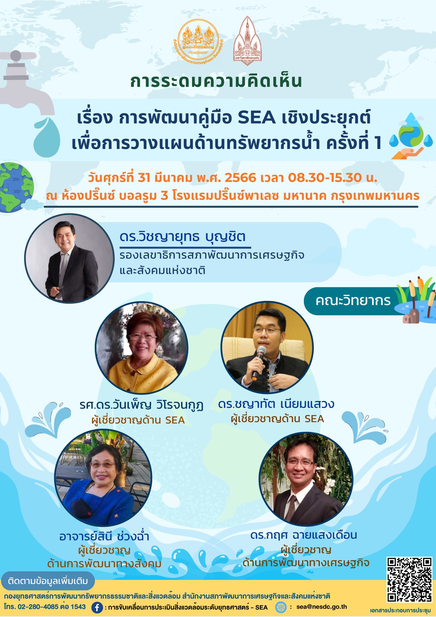 วันนี้ (31 มีนาคม 2566) สำนักงานสภาพัฒนาการเศรษฐกิจและสังคมแห่งชาติ (สศช.) โดยกองยุทธศาสตร์การพัฒนาทรัพยากรธรรมชาติและสิ่งแวดล้อม จัดการประชุมระดมความคิดเห็นการพัฒนาคู่มือการประเมินสิ่งแวดล้อมระดับยุทธศาสตร์เชิงประยุกต์ เพื่อการวางแผนด้านทรัพยากรน้ำ ครั้งที่ 1 ภายใต้การขับเคลื่อนการประเมินสิ่งแวดล้อมระดับยุทธศาสตร์ (SEA) ประจำปีงบประมาณ 2565 ณ ห้องปรินซ์บอลรูม 3 โรงแรมปริ๊นซ์พาเลซ มหานาค กรุงเทพมหานคร โดยมี ดร.วิชญายุทธ บุญชิต รองเลขาธิการสภาพัฒนาการเศรษฐกิจและสังคมแห่งชาติ เป็นประธานเปิดการประชุม