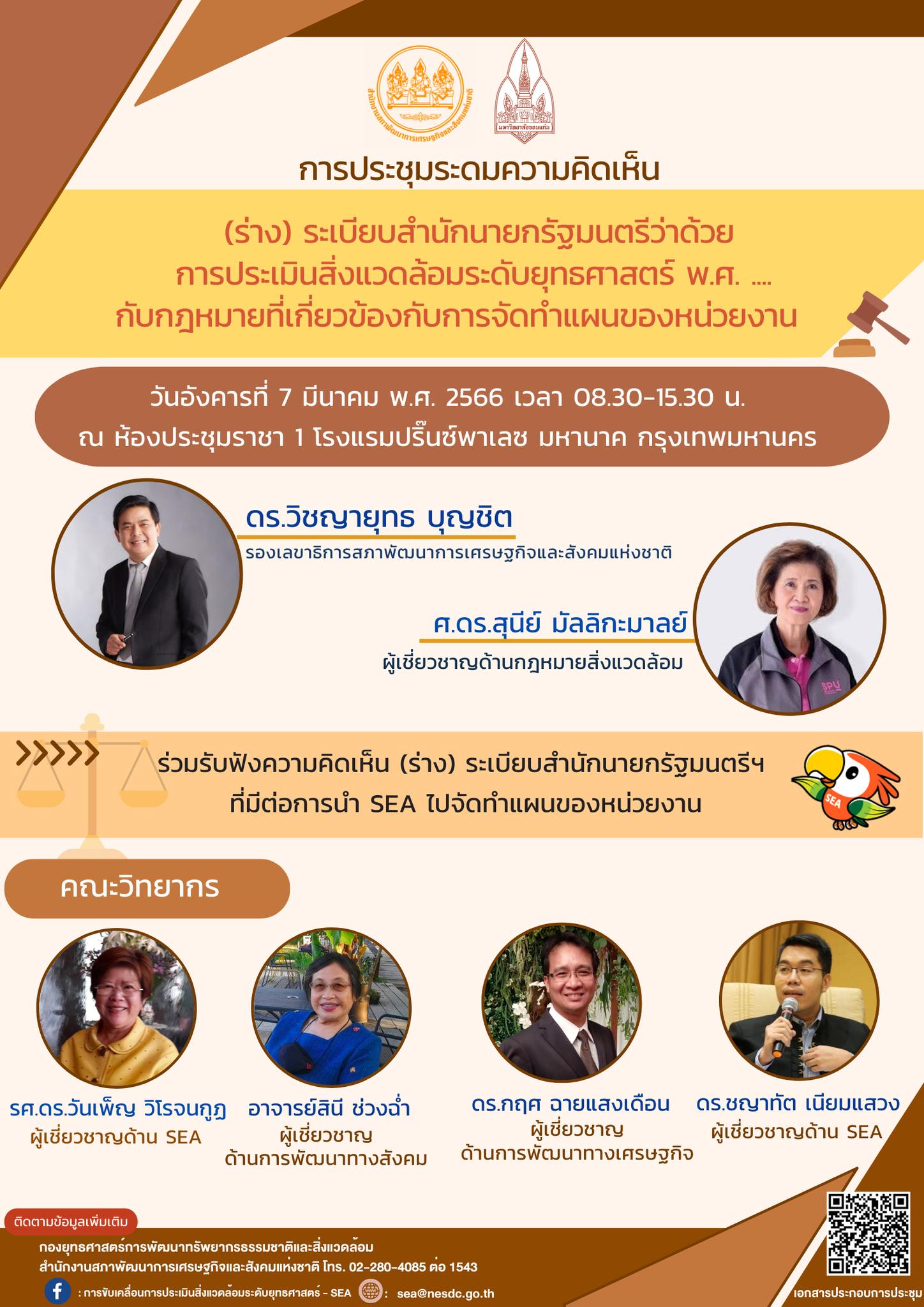 วันนี้ (7 มีนาคม 2566) สำนักงานสภาพัฒนาการเศรษฐกิจและสังคมแห่งชาติ โดยกองยุทธศาสตร์การพัฒนาทรัพยากรธรรมชาติและสิ่งแวดล้อม จัดประชุมระดมความคิดเห็น เรื่อง (ร่าง) ระเบียบสำนักนายกรัฐมนตรีว่าด้วยการประเมินสิ่งแวดล้อมระดับยุทธศาสตร์ พ.ศ. …. กับกฎหมายที่เกี่ยวข้องกับการจัดทำแผนของหน่วยงาน ภายใต้การขับเคลื่อนการประเมินสิ่งแวดล้อมระดับยุทธศาสตร์ (SEA) ประจำปีงบประมาณ 2565 ณ ห้องประชุมราชา 1 โรงแรมปริ๊นซ์พาเลซ มหานาค กรุงเทพมหานคร โดยมี นางสาวนุชจรี วงษ์สันต์ ที่ปรึกษาด้านนโยบายและแผนงาน สำนักงานสภาพัฒนาการเศรษฐกิจและสังคมแห่งชาติ เป็นประธานเปิดการประชุม