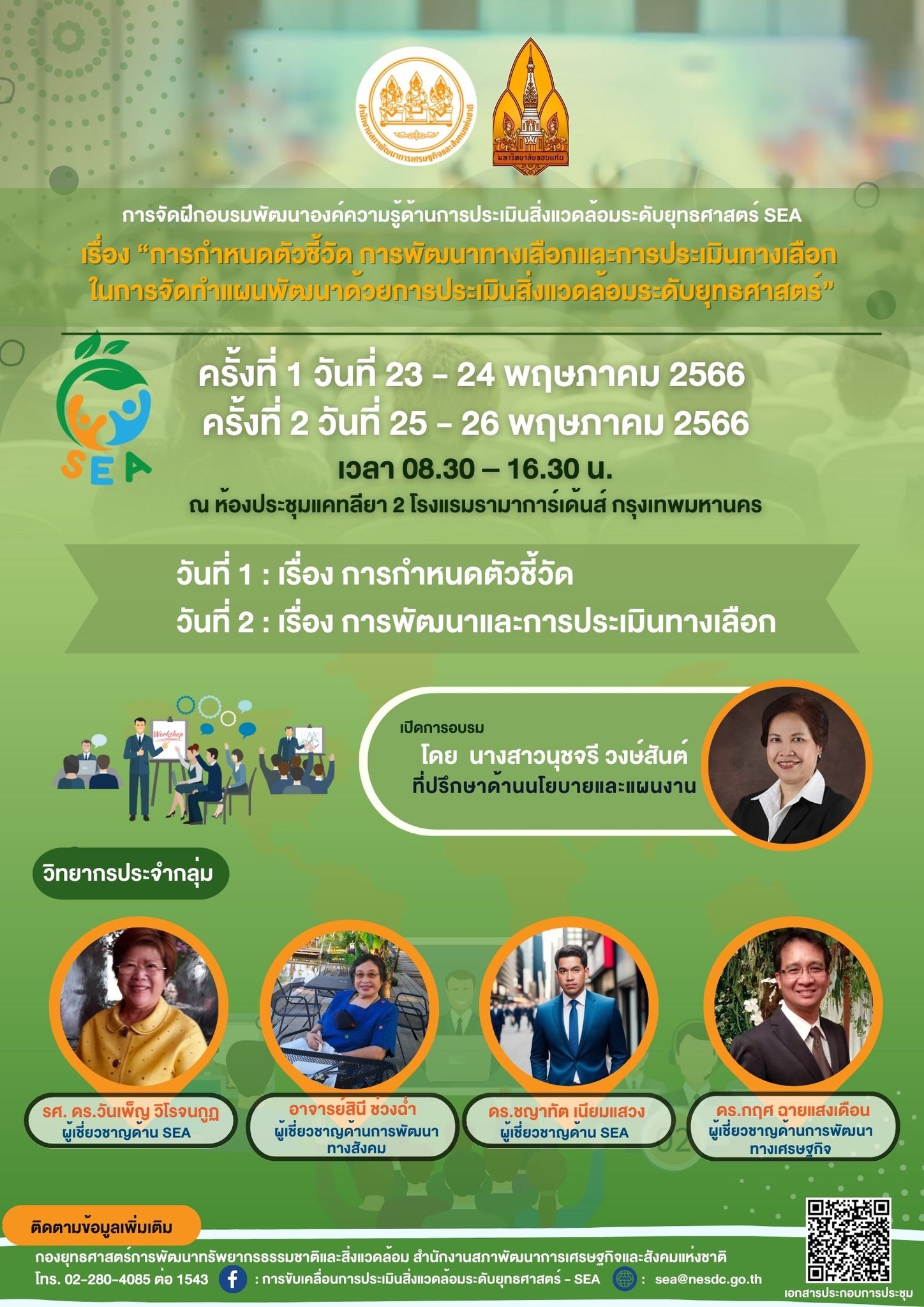 เมื่อวันที่ 23 – 26 พฤษภาคม 2566 สำนักงานสภาพัฒนาการเศรษฐกิจและสังคมแห่งชาติ โดยกองยุทธศาสตร์การพัฒนาทรัพยากรธรรมชาติและสิ่งแวดล้อม จัดฝึกอบรมพัฒนาองค์ความรู้ด้านการประเมินสิ่งแวดล้อมระดับยุทธศาสตร์ (SEA) เรื่อง “การกำหนดตัวชี้วัด การพัฒนาทางเลือกและการประเมินทางเลือกในการจัดทำแผนพัฒนาด้วยการประเมินสิ่งแวดล้อมระดับยุทธศาสตร์” ภายใต้ โครงการการขับเคลื่อนการประเมินสิ่งแวดล้อมระดับยุทธศาสตร์ ประจำปีงบประมาณ 2565 ณ ห้องประชุมแคทลียา 2 โรงแรมรามาการ์เด้นส์ กรุงเทพมหานคร ซึ่งแบ่งการอบรมออกเป็น 2 ครั้ง คือ ครั้งที่ 1 ระหว่างวันที่ 23 – 24 พฤษภาคม 2566 และครั้งที่ 2 ระหว่างวันที่ 25 – 26 พฤษภาคม 2566 โดยมี นางสาวนุชจรี วงษ์สันต์ ที่ปรึกษาด้านนโยบายและแผนงาน เป็นประธานเปิดการอบรม