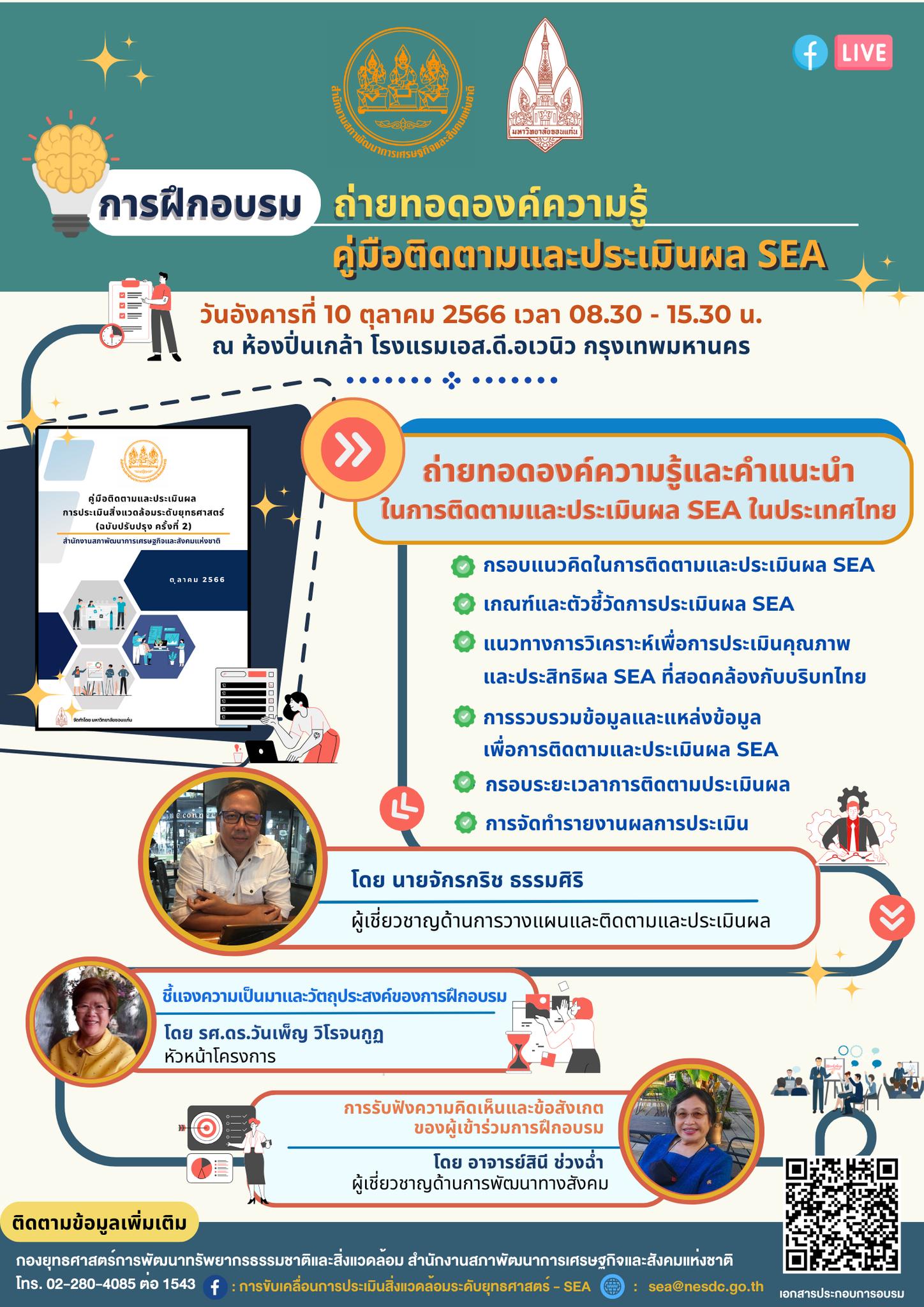 สำนักงานสภาพัฒนาการเศรษฐกิจและสังคมแห่งชาติจัดฝึกอบรม เรื่อง การถ่ายทอดองค์ความรู้การนำคู่มือติดตามและประเมินผลการประเมินสิ่งแวดล้อมระดับยุทธศาสตร์ไปสู่การปฏิบัติ ให้กับหน่วยงานที่เกี่ยวข้อง เพื่อสร้างความรู้ความเข้าใจเกี่ยวกับการติดตามและประเมินผลการจัดทำแผนด้วย SEA รวมถึงการตรวจสอบคุณภาพของการจัดทำ SEA ในการวางแผนที่เป็นไปตามมาตรฐานทางวิชาการ