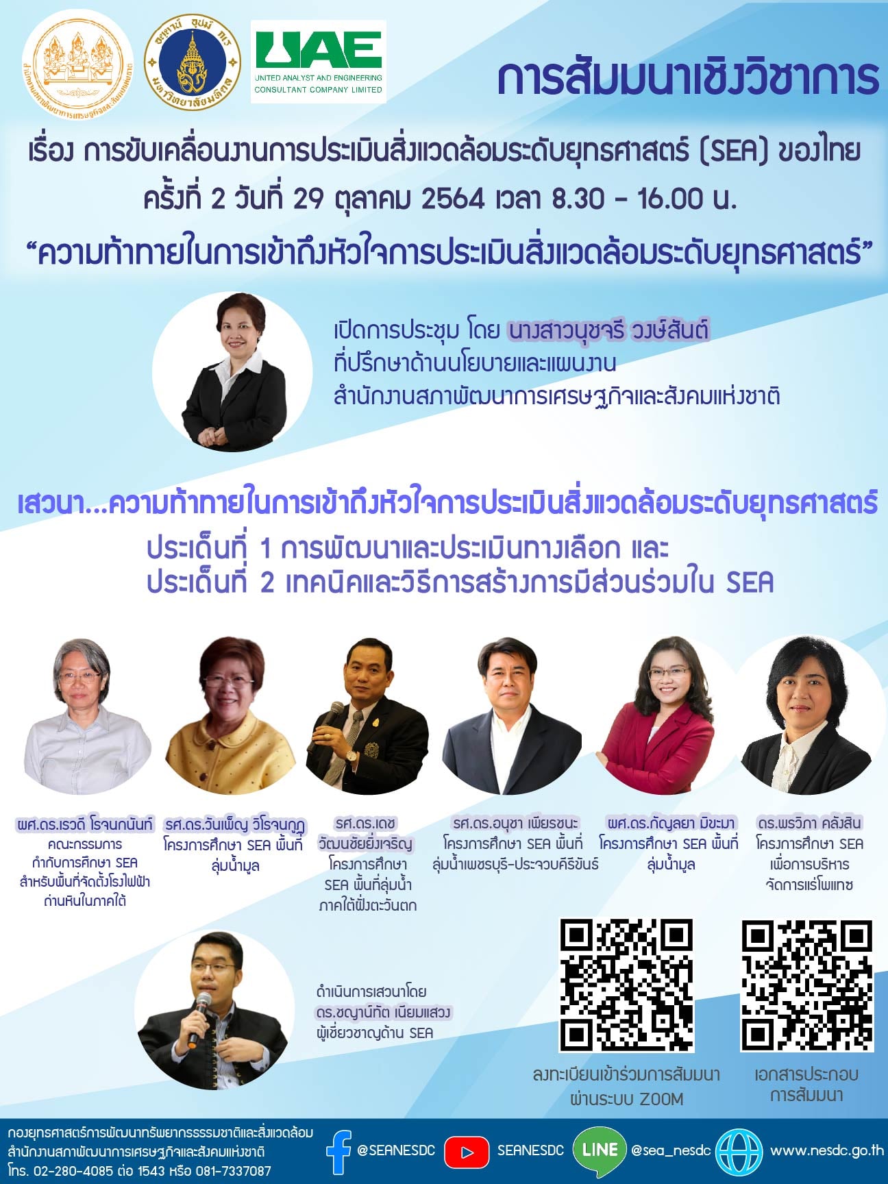 เมื่อวันที่ 29 ตุลาคม 2564 นางสาวนุชจรี วงษ์สันต์ ที่ปรึกษาด้านนโยบายและแผนงาน สำนักงานสภาพัฒนาการเศรษฐกิจและสังคมแห่งชาติ (สศช.) เป็นประธานเปิดการสัมมนาเชิงวิชาการ เรื่อง การขับเคลื่อนงานการประเมินสิ่งแวดล้อมระดับยุทธศาสตร์ (SEA) ของไทย ในหัวข้อ “ความท้าทายในการเข้าถึงหัวใจการประเมินสิ่งแวดล้อมระดับยุทธศาสตร์” ภายใต้โครงการขับเคลื่อนการประเมินสิ่งแวดล้อมระดับยุทธศาสตร์ (SEA) ประจำปีงบประมาณ 2564 ผ่านระบบการประชุมทางไกล Zoom Meeting โดยมีผู้แทนจากหน่วยงานภาครัฐ ภาคเอกชน สถาบันการศึกษา บริษัทที่ปรึกษา และเจ้าหน้าที่ สศช. เข้าร่วมประชุม